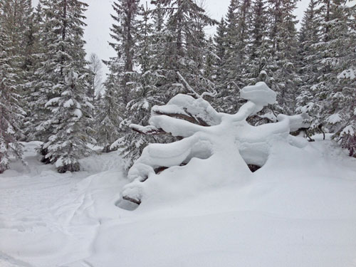 Rett ved vannskille-posten ligger en snø-påske-egg i ei furu 🙂