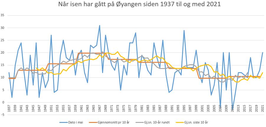 I år gikk isen seint. Gjennomsnittet for 60-tallet (10 år) var 19,8 så det er omtrent så lenge som isen lå i gjennomsnitt på 60-tallet. I 2010 og 2008 lå isen like lenge som i år.