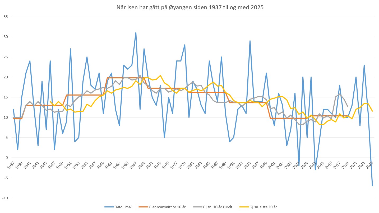 I år gikk isen eksepsjonelt tidlig – aldri før har det gått så tidlig! Det nærmeste vi kommer er 2011 da den gikk 28. april og 2007 da den gikk 29. april.